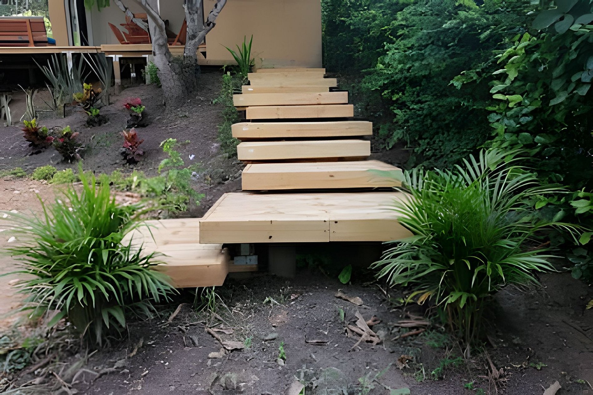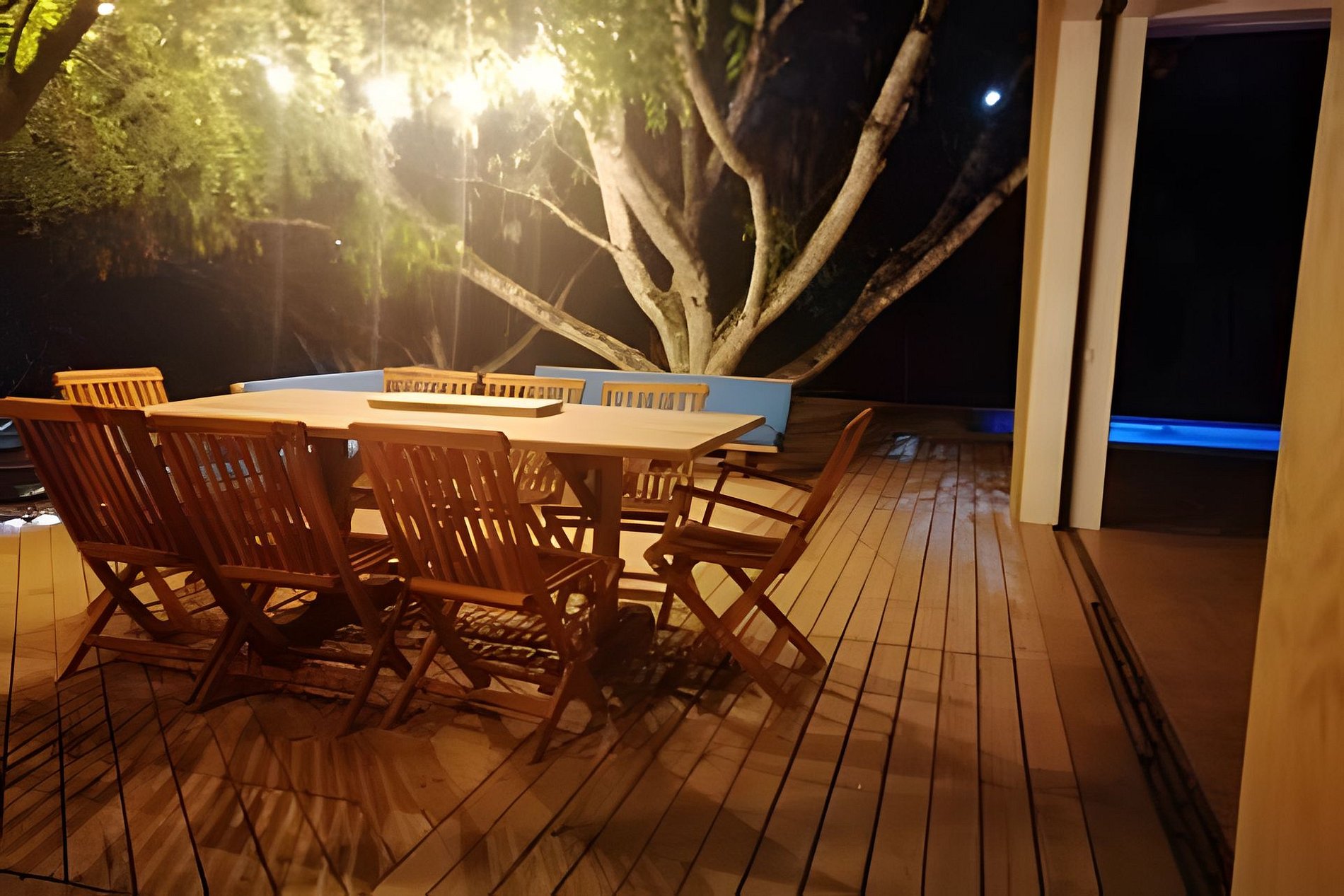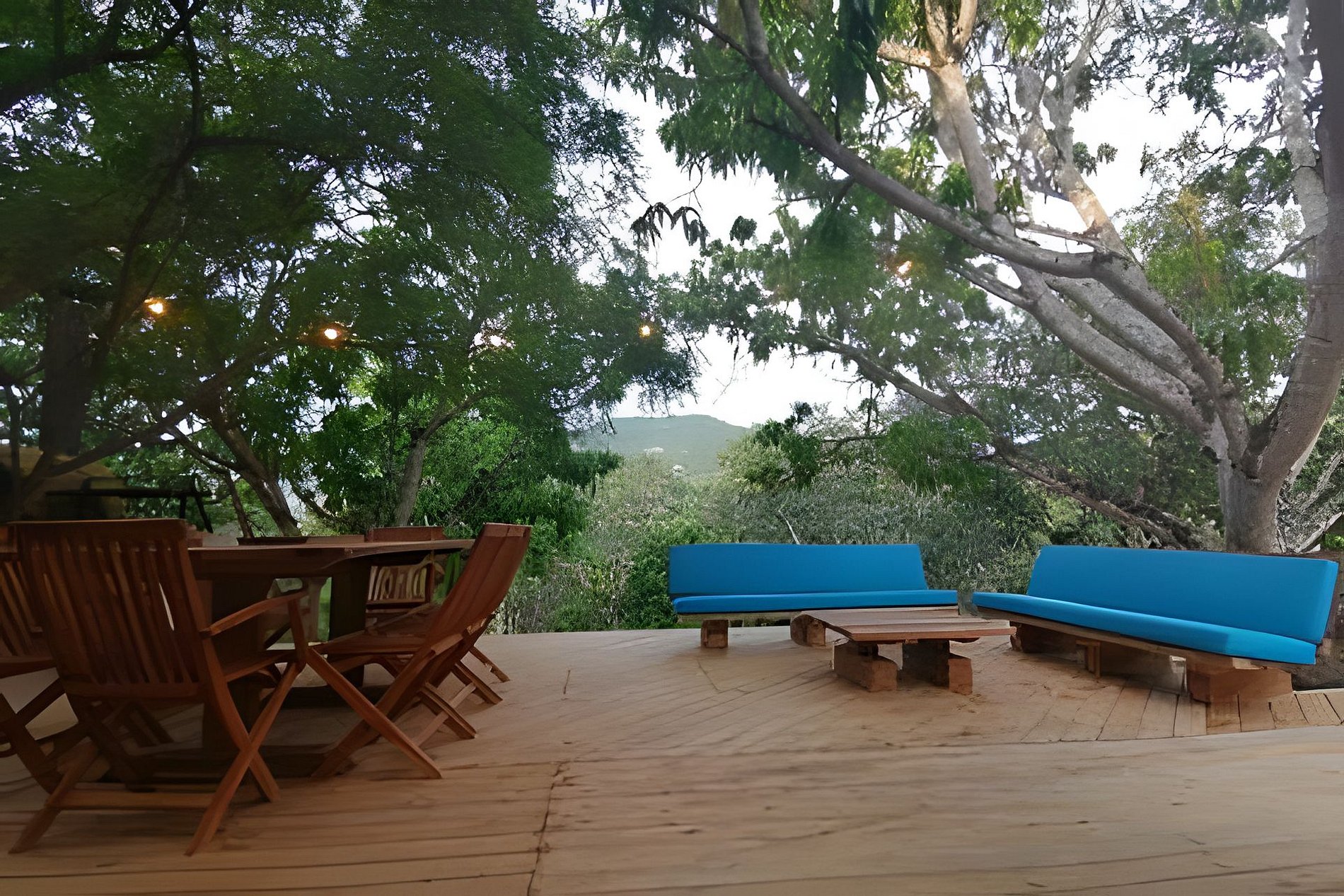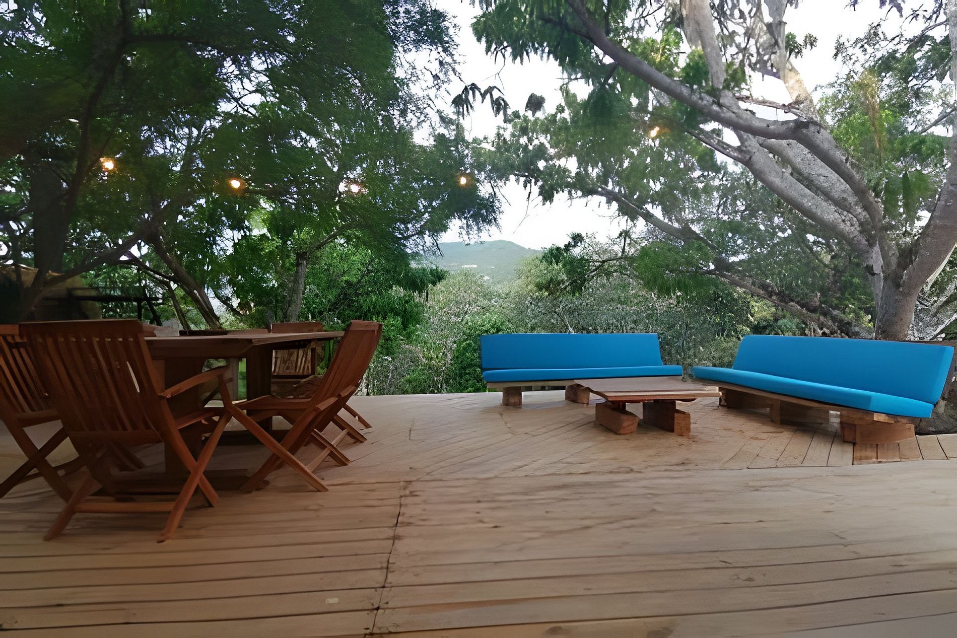 La sala y comedor está ubicada bajo árboles y desde ahí se tiene una vista panorámica hacia dentro y fuera de la casa. Cuenta con un juego de muebles rústicos en madera compuesto por 2 sofás de 3 puestos y 1 mesa de centro.