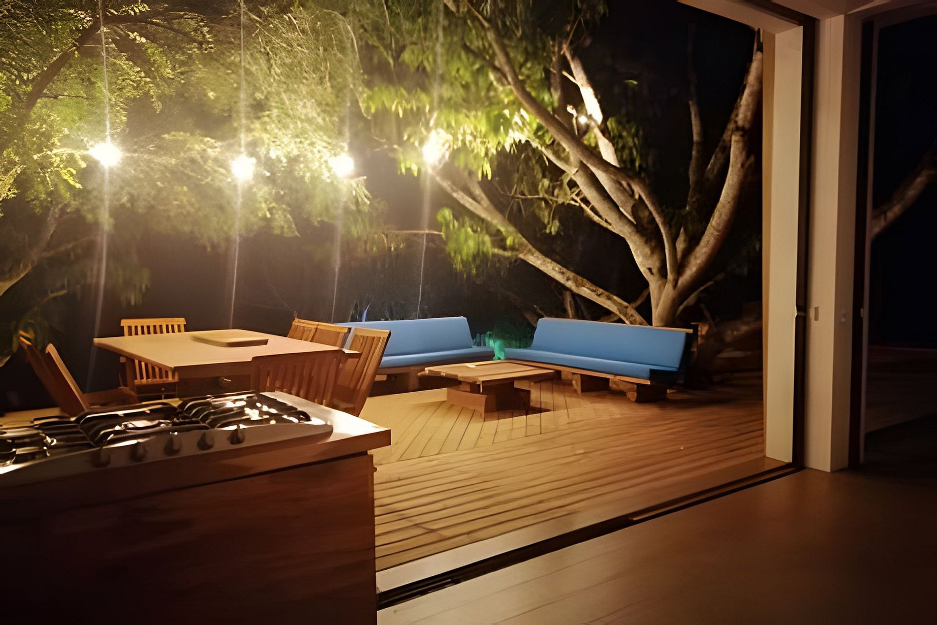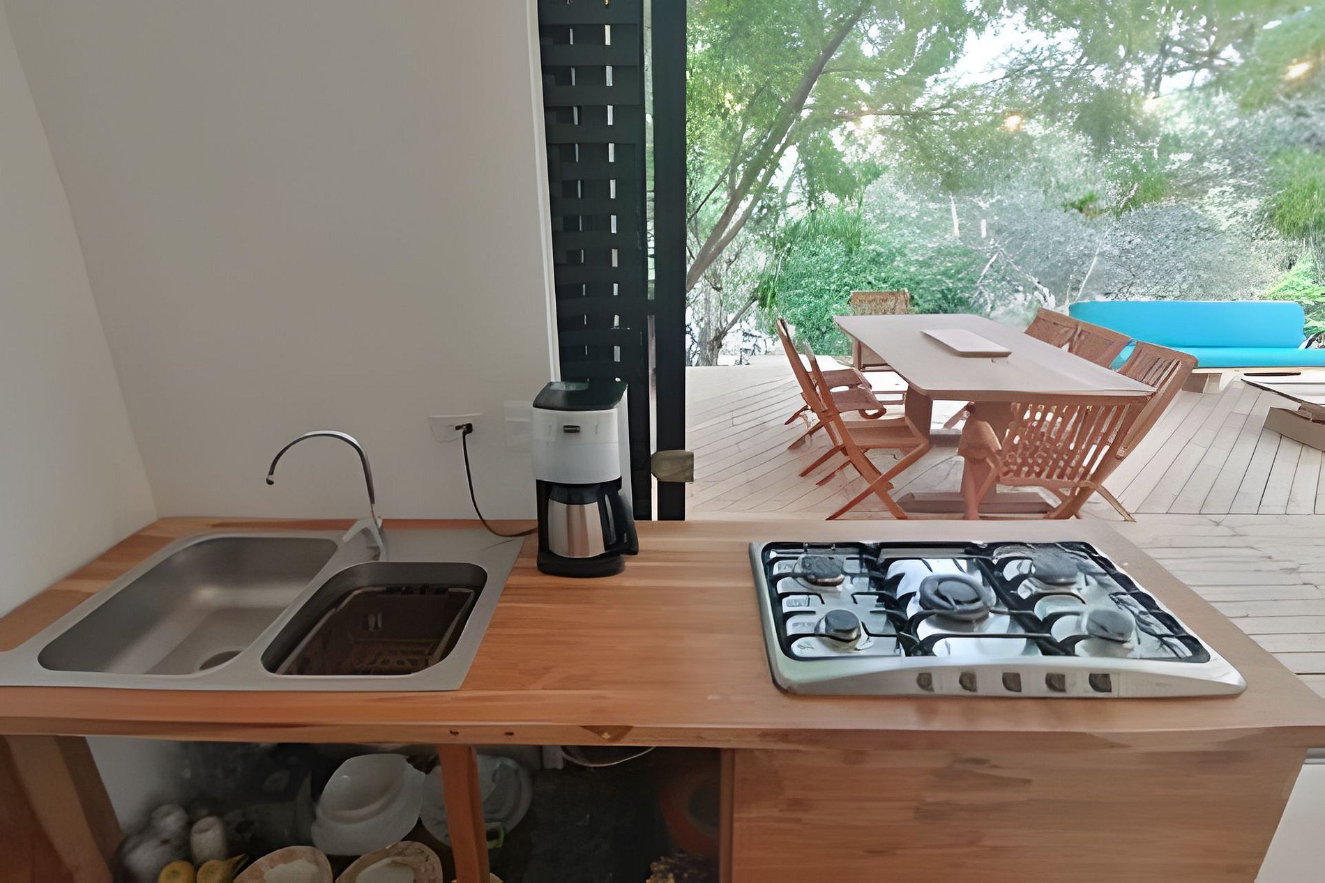 La segunda parte de la casa es cubierta y cuenta con cocina, TV, y 2 habitaciones cada una con baño privado.