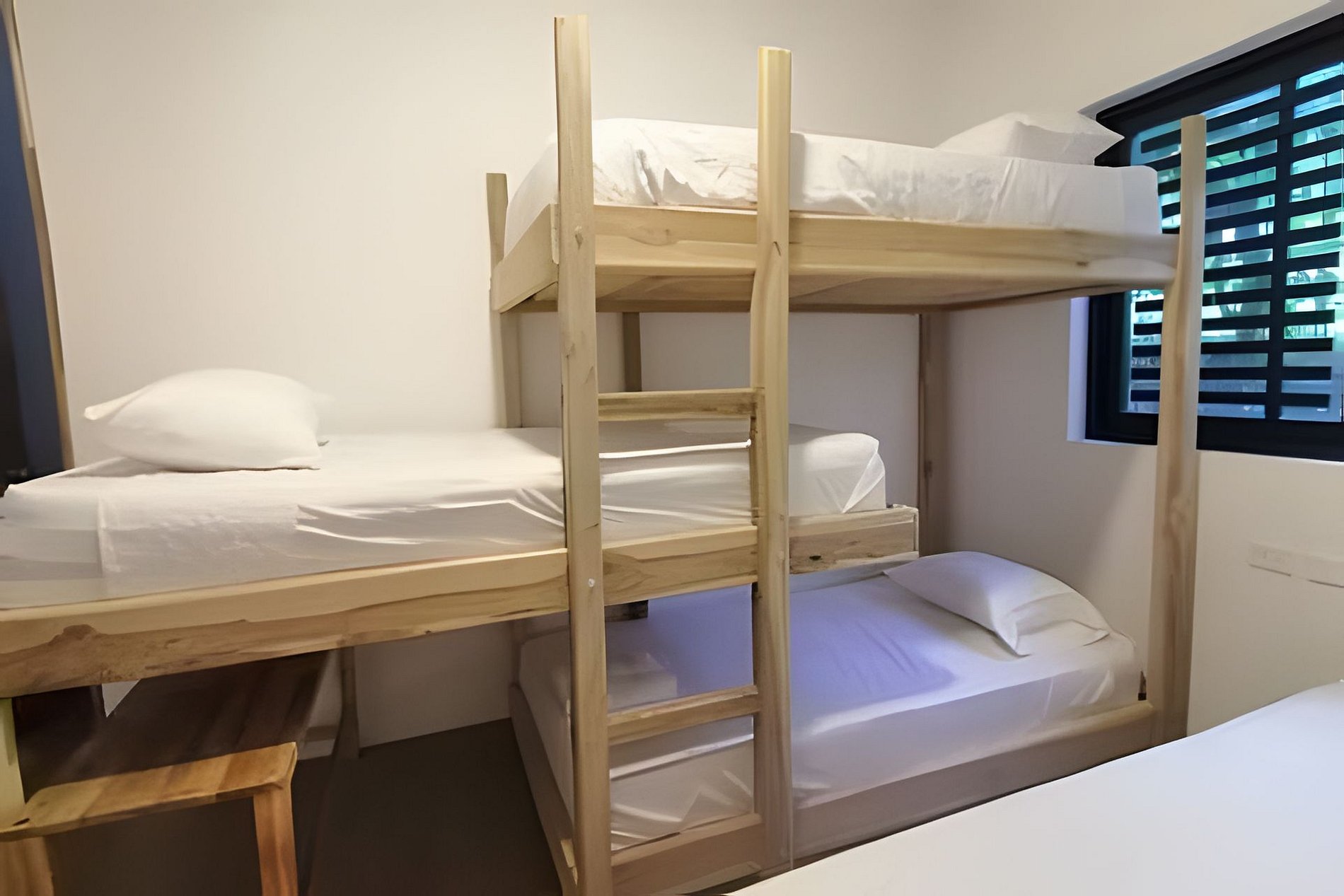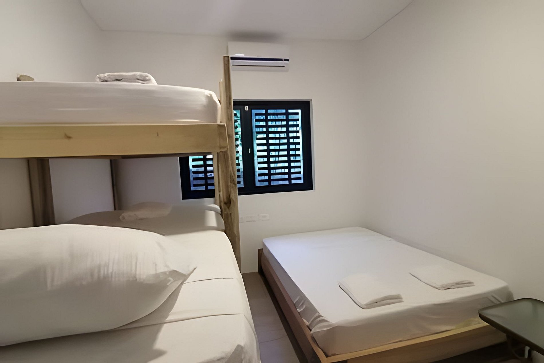 Las 2 habitaciones son iguales, tiene aire acondicionado, una cama doble y un camarote de 3 niveles para una acomodacion de 5 personas en cada habitación.