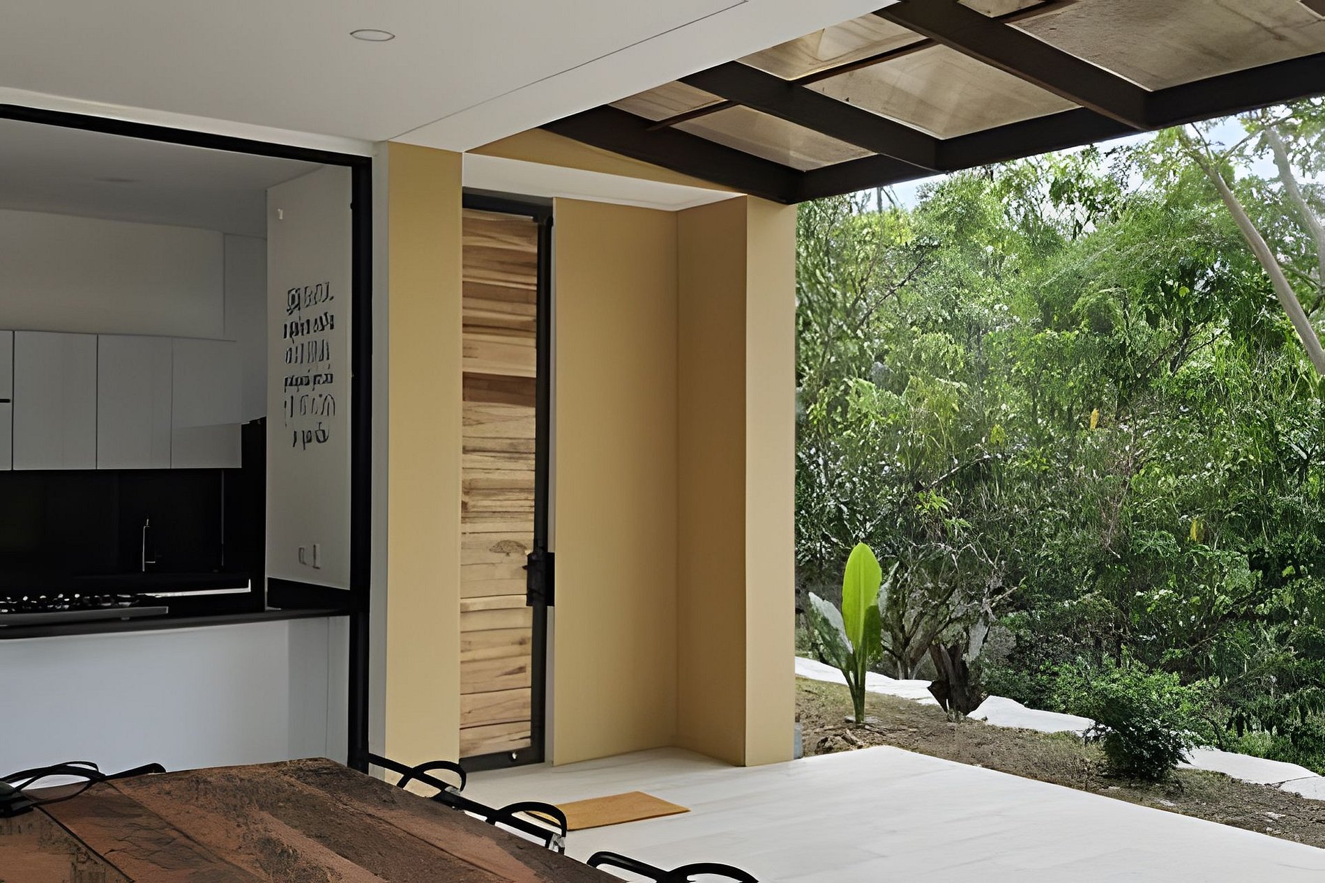 La casa tiene 450 mts2 en un lote de 1.000 mts2. Se parquean los carros frente a la casa, quedan al aire libre. Caben hasta 5 carros. La casa está distribuida en dos pisos. En el primer piso está el comedor, cocina, sala, bbq, piscina/jacuzzi, baño social. También 2 habitaciones. La sala está ubicada bajo un árbol y desde ahí se tiene una vista panorámica hacia dentro y fuera de la casa. Cuenta con un juego de muebles rústicos en madera a pocos metros de la piscina. El comedor es de 12 puestos y está hecho de madera rústica. El segundo piso de la casa tiene las otras 2 habitaciones, y una amplia terraza. La cocina es abierta y está integrada al comedor. Es una cocina integral con todas las comodidades. La cocina cuenta con nevecón, estufa a gas de 5 puestos, cafetera eléctrica y demás menaje necesario. Las 4 habitaciones son iguales, con una cama doble y un camarote de 2 niveles para una acomodación de 4 personas en cada habitación. Todas las habitaciones tienen aire acondicionado, Smart TV, ventilador de techo y baño privado. Las duchas tienen agua caliente.