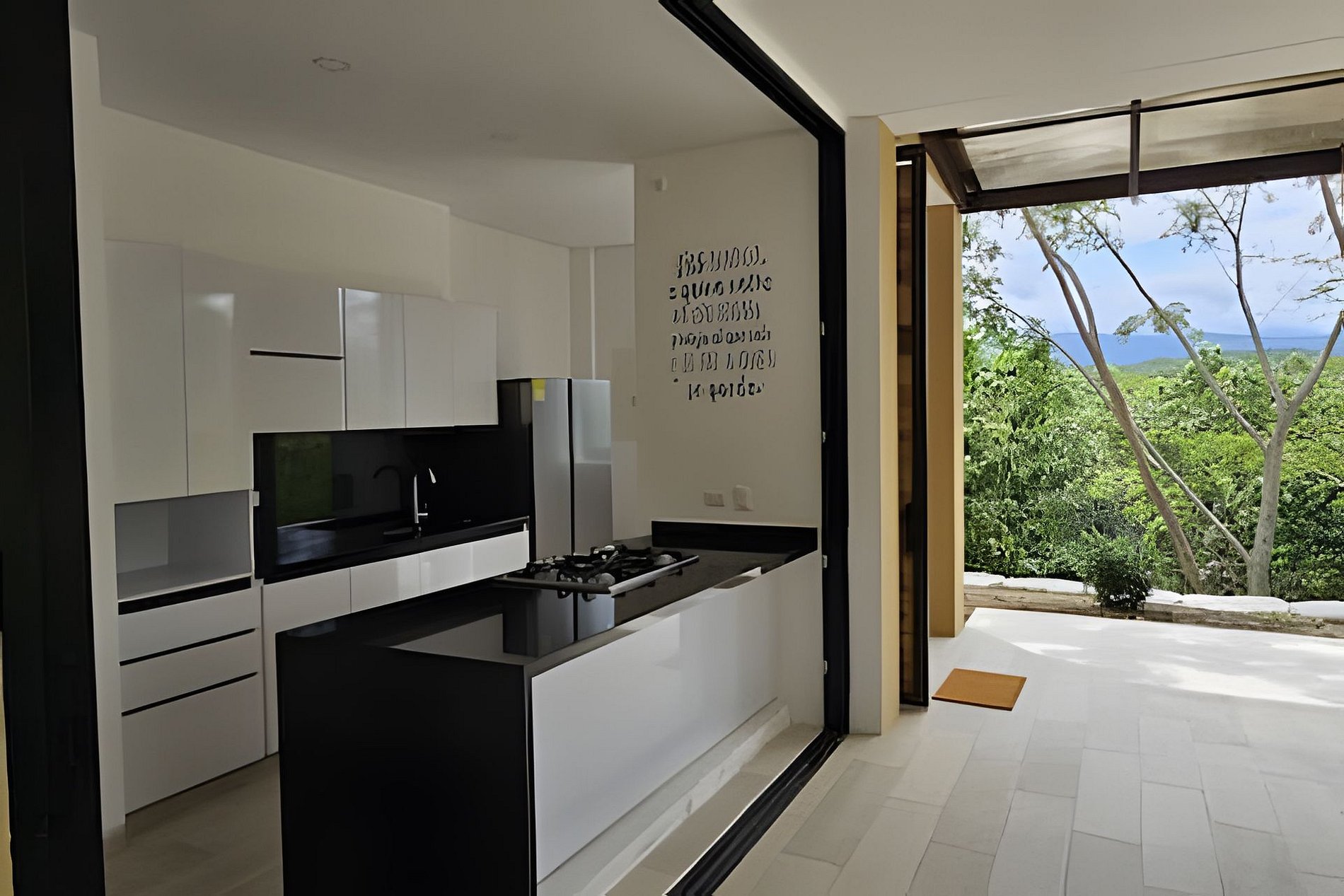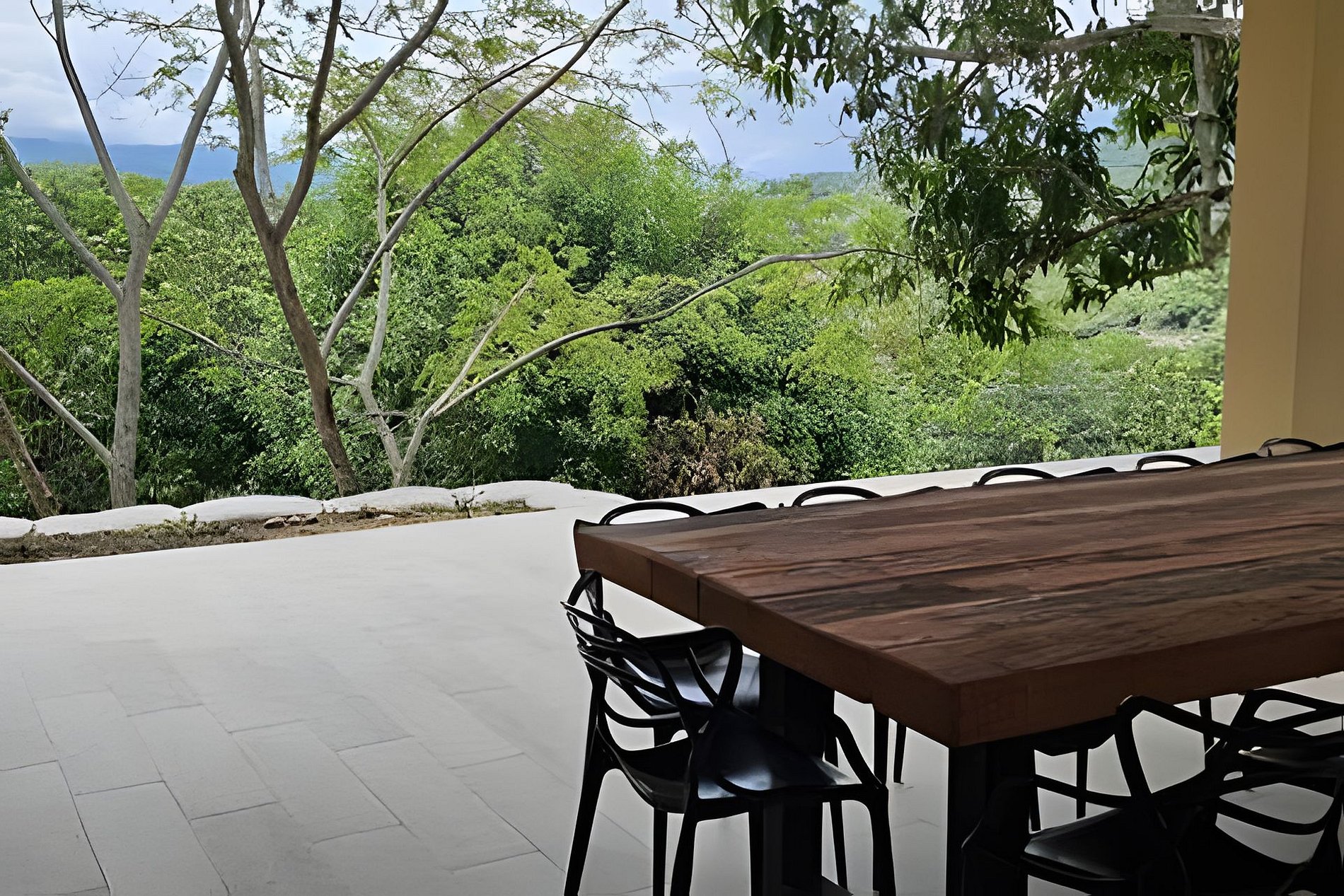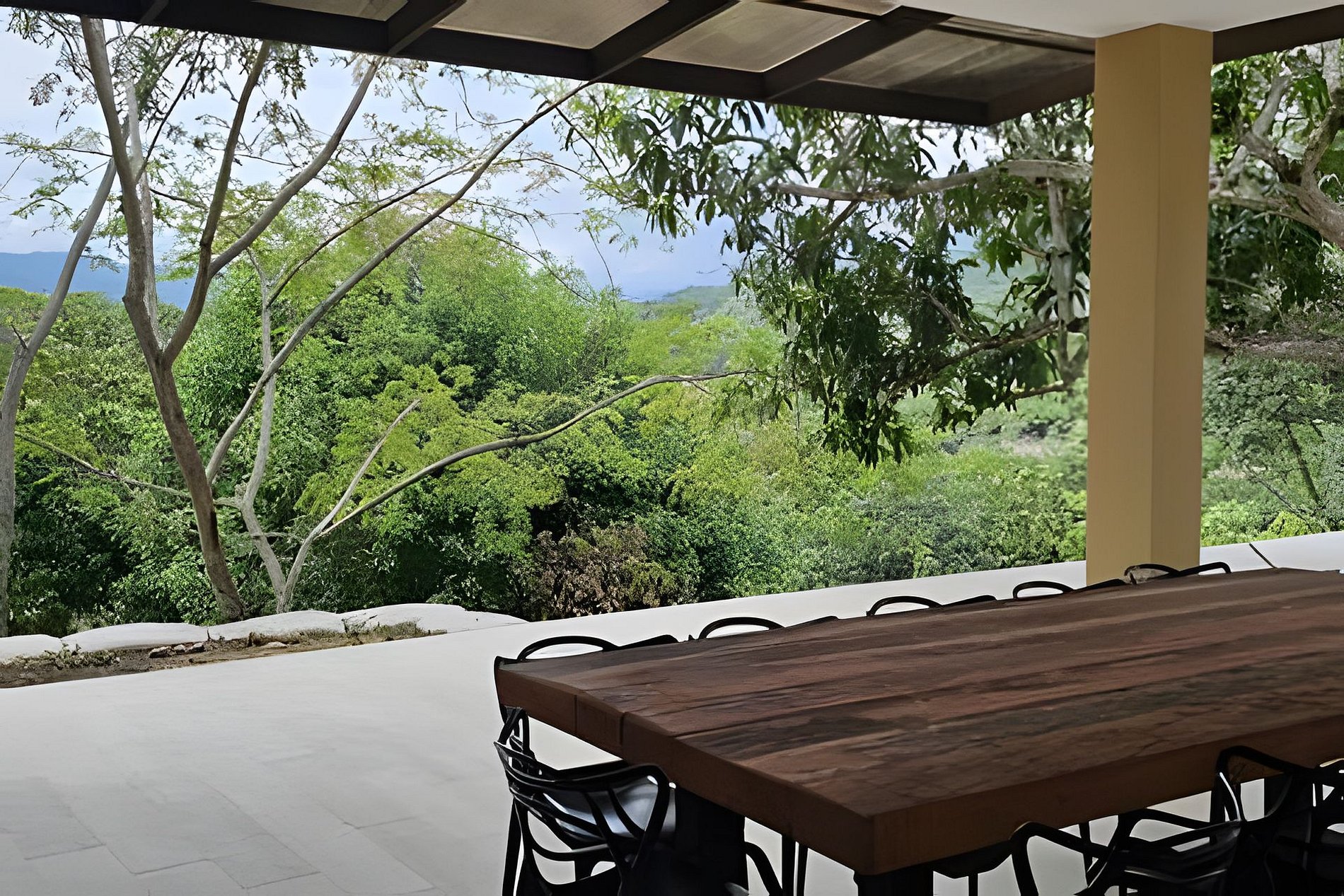 La casa tiene 450 mts2 en un lote de 1.000 mts2. Se parquean los carros frente a la casa, quedan al aire libre. Caben hasta 5 carros. La casa está distribuida en dos pisos. En el primer piso está el comedor, cocina, sala, bbq, piscina/jacuzzi, baño social. También 2 habitaciones. La sala está ubicada bajo un árbol y desde ahí se tiene una vista panorámica hacia dentro y fuera de la casa. Cuenta con un juego de muebles rústicos en madera a pocos metros de la piscina. El comedor es de 12 puestos y está hecho de madera rústica. El segundo piso de la casa tiene las otras 2 habitaciones, y una amplia terraza. La cocina es abierta y está integrada al comedor. Es una cocina integral con todas las comodidades. La cocina cuenta con nevecón, estufa a gas de 5 puestos, cafetera eléctrica y demás menaje necesario. Las 4 habitaciones son iguales, con una cama doble y un camarote de 2 niveles para una acomodación de 4 personas en cada habitación. Todas las habitaciones tienen aire acondicionado, Smart TV, ventilador de techo y baño privado. Las duchas tienen agua caliente.