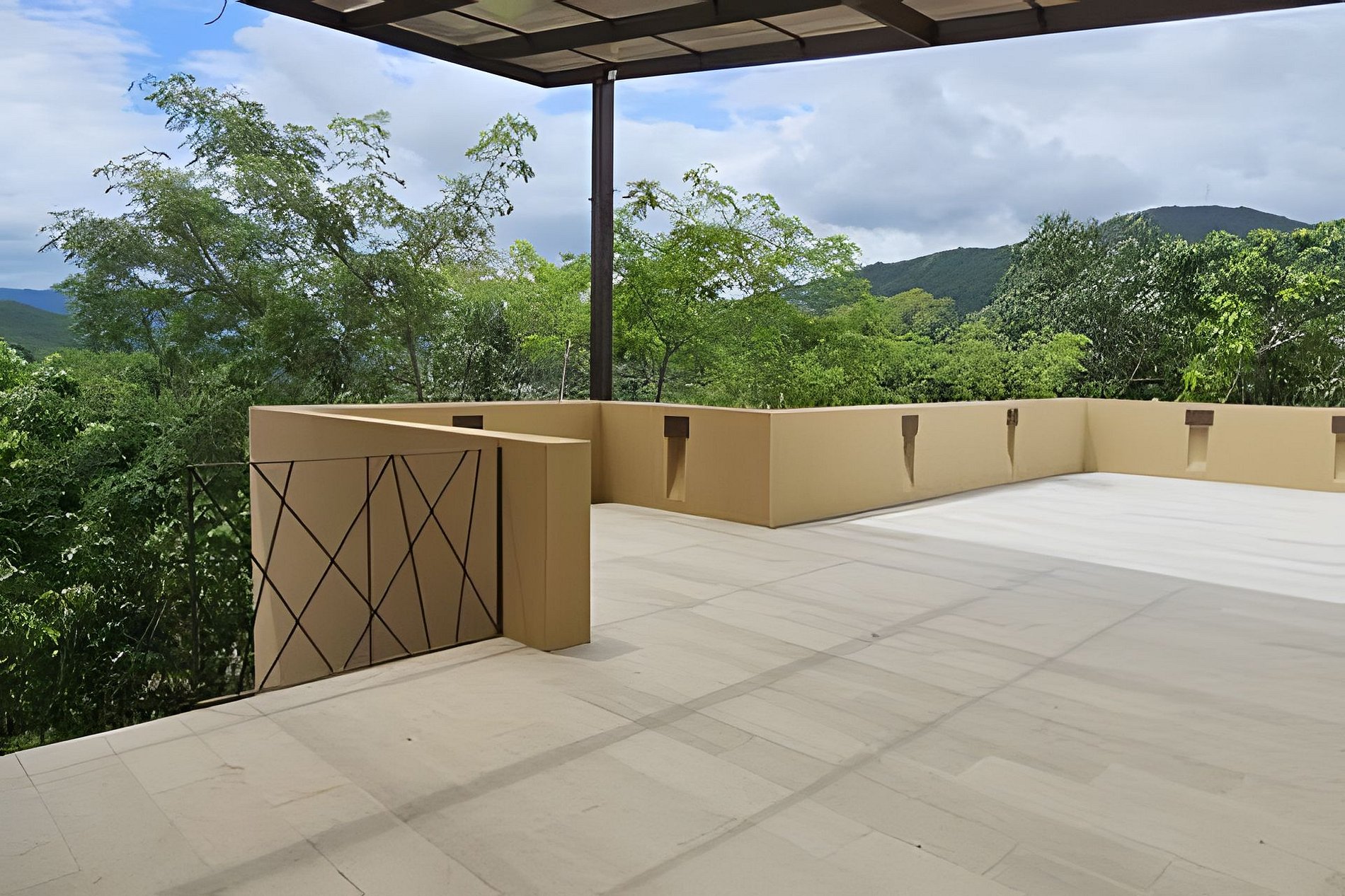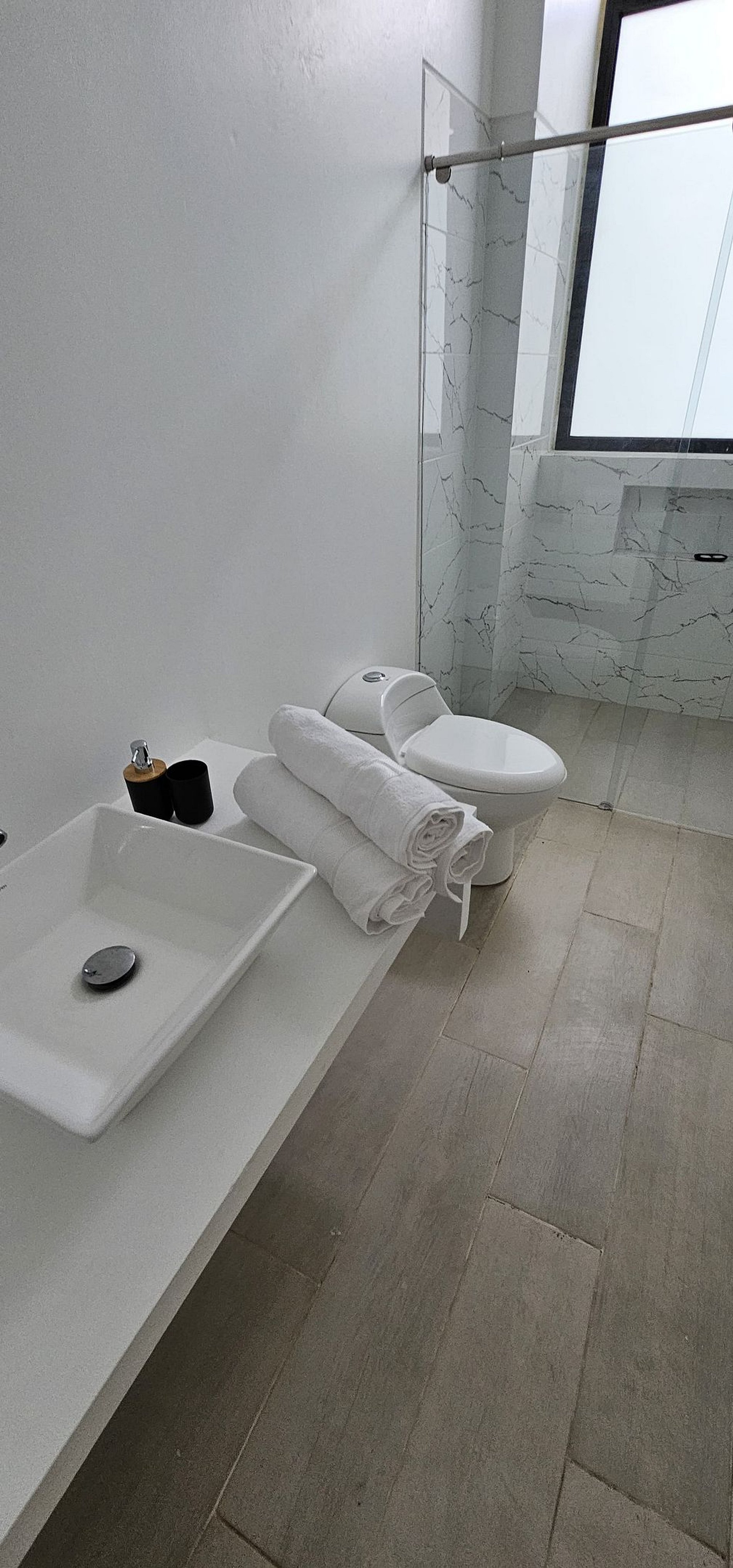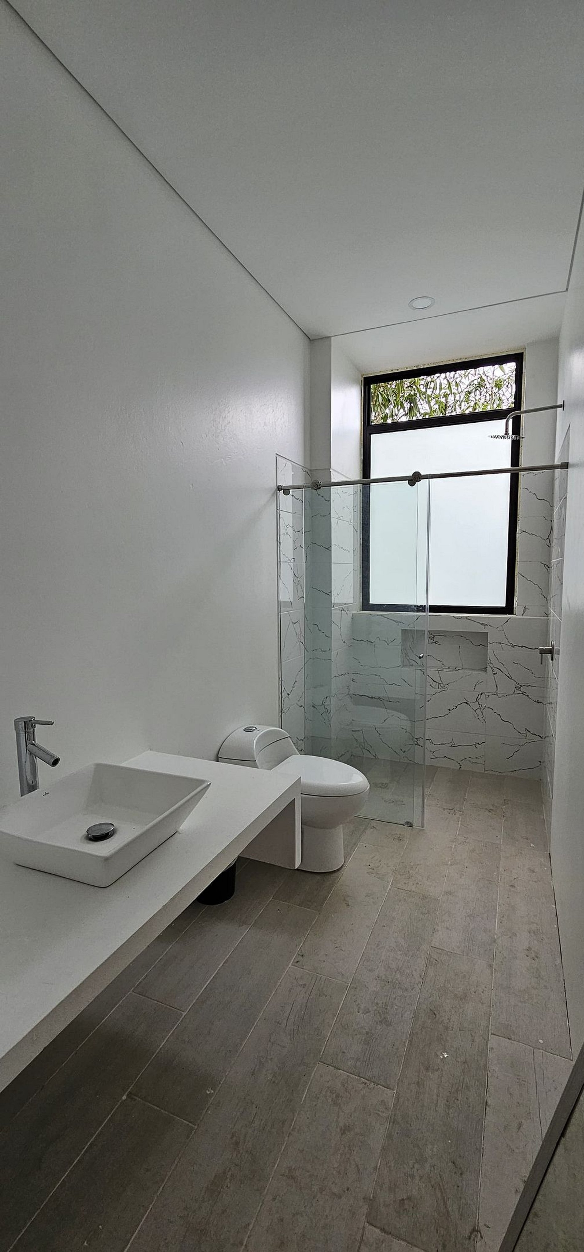 La casa tiene 450 mts2 en un lote de 1.000 mts2. Se parquean los carros frente a la casa, quedan al aire libre. Caben hasta 5 carros. La casa está distribuida en dos pisos. En el primer piso está el comedor, cocina, sala, bbq, piscina/jacuzzi, baño social. También 2 habitaciones. La sala está ubicada bajo un árbol y desde ahí se tiene una vista panorámica hacia dentro y fuera de la casa. Cuenta con un juego de muebles rústicos en madera a pocos metros de la piscina. El comedor es de 12 puestos y está hecho de madera rústica. El segundo piso de la casa tiene las otras 2 habitaciones, y una amplia terraza. La cocina es abierta y está integrada al comedor. Es una cocina integral con todas las comodidades. La cocina cuenta con nevecón, estufa a gas de 5 puestos, cafetera eléctrica y demás menaje necesario. Las 4 habitaciones son iguales, con una cama doble y un camarote de 2 niveles para una acomodación de 4 personas en cada habitación. Todas las habitaciones tienen aire acondicionado, Smart TV, ventilador de techo y baño privado. Las duchas tienen agua caliente.